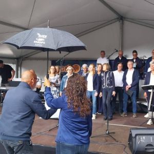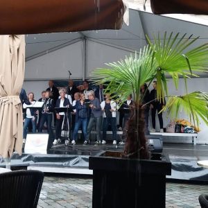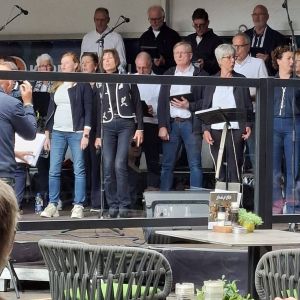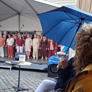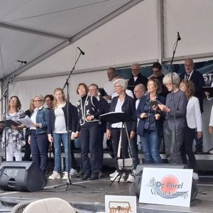 Op zaterdag 13 september 2025 hebben we deelgenomen aan het Korenfestival ‘EigenWijs’ in Bergen op Zoom. Op 11 locaties traden 40 koren op. Het festival vond plaats tijdens de Open Monumentendag 2025. De dag begon prima, met een zonnetje en een briesje hadden we ons eerste optreden op het Gouvernementsplein. Mooie plek met een goed gevuld plein en naastgelegen terras.